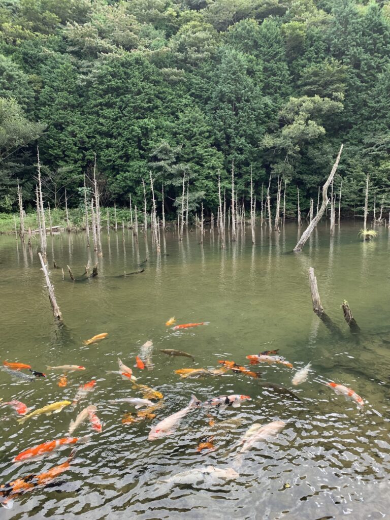 100円で鯉の餌を買って鯉数匹にあげていたら、段々と鯉が集まり始めて、とんでもない密集状態に!4,50センチサイズの鯉がバシャバシャと餌に集まる光景はまさに圧巻でした。